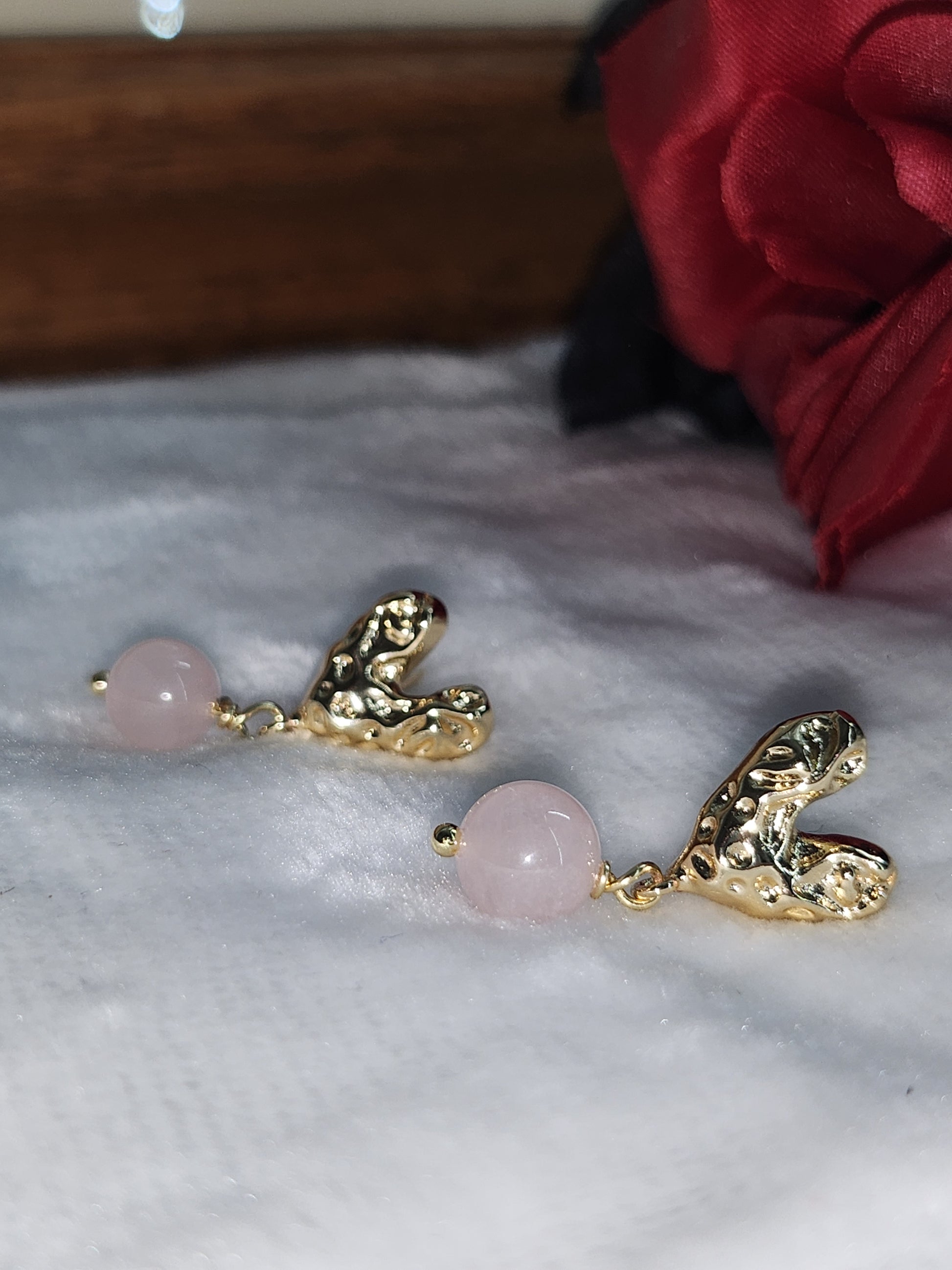 Earrings made with 14k gold filled materials and natural stone rose quartz meaning self-love.